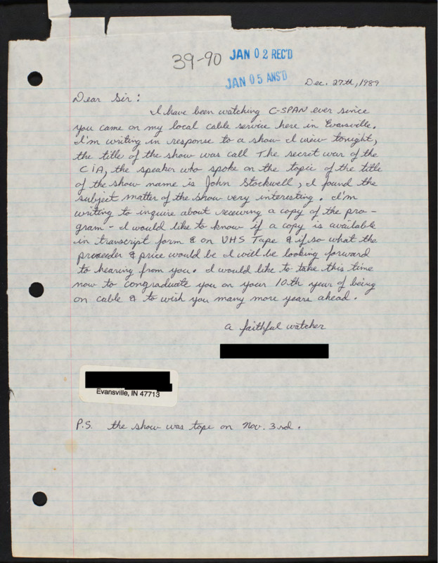 Enjoys C-SPAN's programming and inquires about purchasing a tape of an aired program.