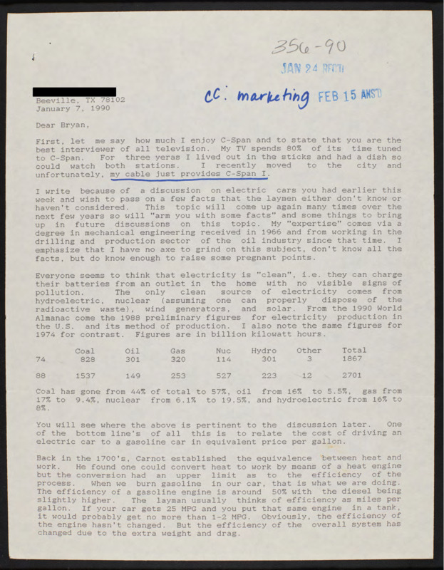 Praises C-SPAN and shares data about electric cars and the oil industry.