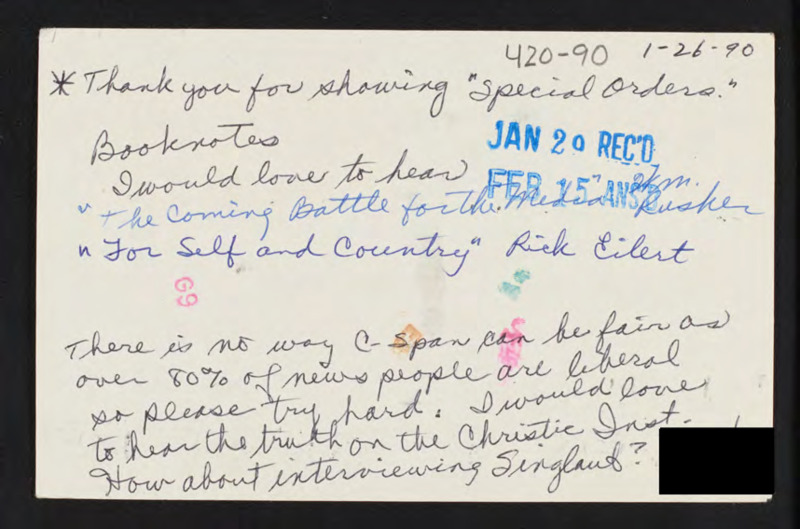 Requests Publication for discussion on the Booknotes program. Urges C-SPAN to remain an unbiased network.