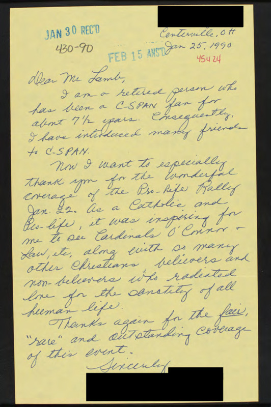 Praises C-SPAN for coverage of a pro-life rally. Mentions ideas about religion in the United States.