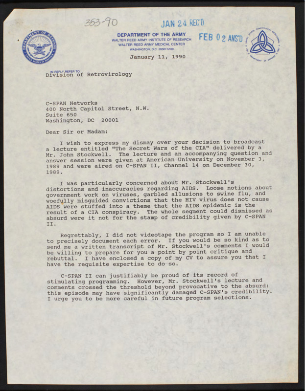 Criticizes C-SPAN2 for airing John Stockwell. Shares that Stockwell's rhetoric is dangerous to AIDS stigma and public health.