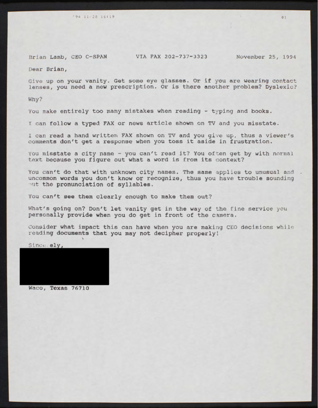 Letter to C-SPAN, 1994-11-25; 76710