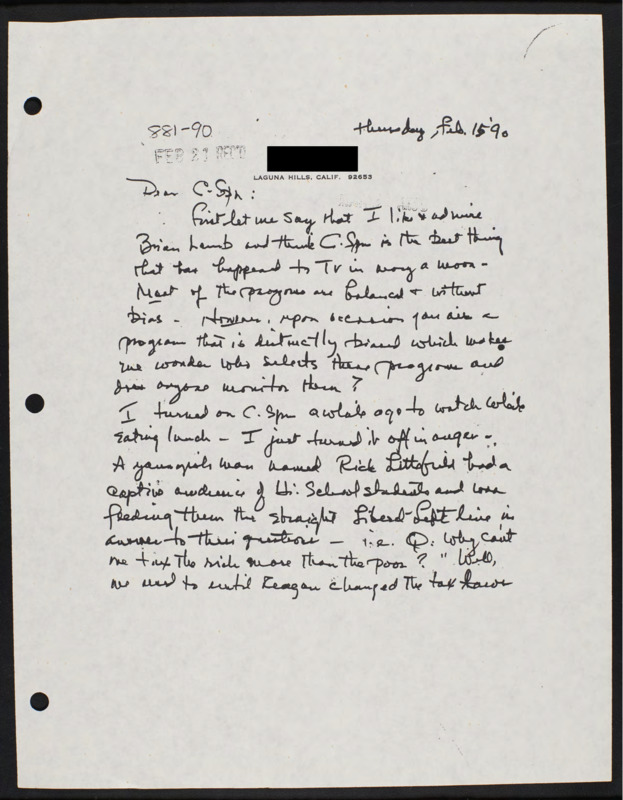 Praises C-SPAN as favorite program because it is without bias. Later discusses United States economic issues.