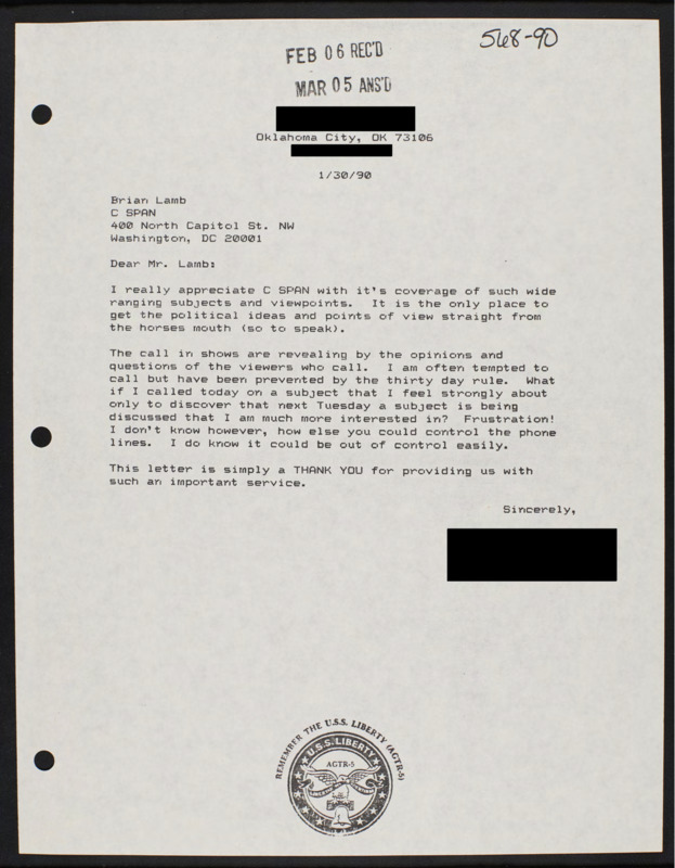 Letter to C-SPAN, 1990-01-30; 73106