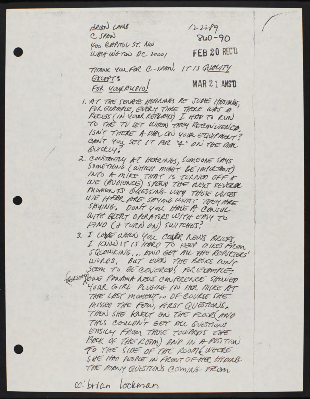 Letter to C-SPAN, 1989-12-22; 80238