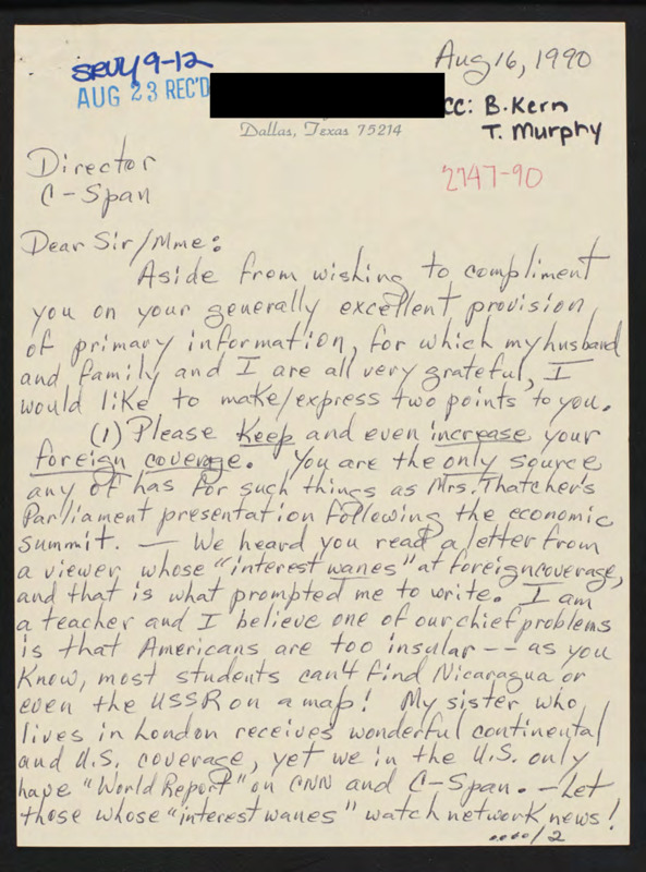 Suggests C-SPAN increase coverage of foreign affairs and become more economically accessible for the elderly.