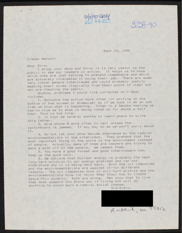 Letter to C-SPAN, 1990-09-29; 99352