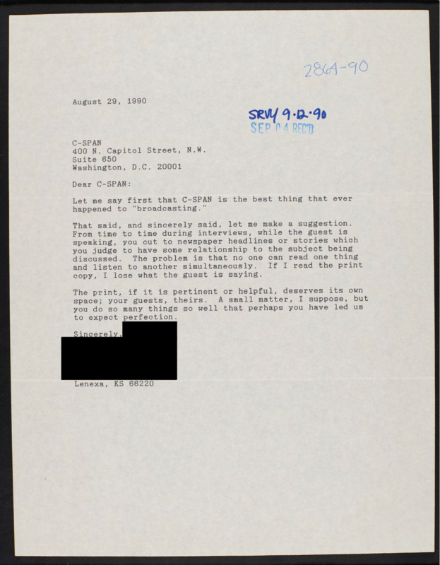 Letter to C-SPAN, 1990-08-29; 66220