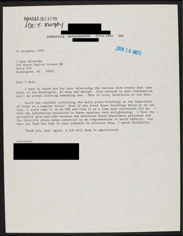 Praises C-SPAN for coverage of live events, requests more coverage of daily press briefings.