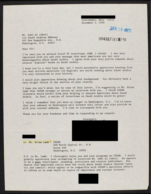 Requests Adel Al Jubeir to appear on C-SPAN to discuss Saudi-Arabia.