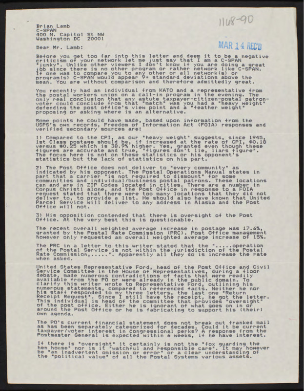 Discusses a debate appearing on C-SPAN between an individual from KATO and a Post-Office representative.