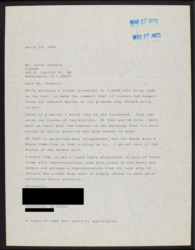 Requests C-SPAN to do a round-table discussion about two pieces of legislation that will affect social security.