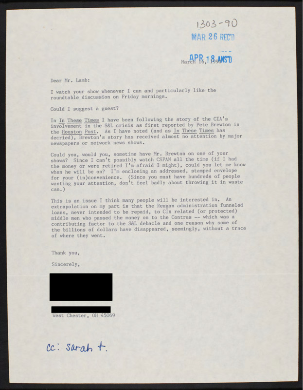 Requests C-SPAN to invite a guest to discuss the involvements of the C.I.A.