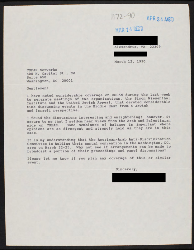 Recommends C-SPAN provide coverage of the American-Arab Anti-Discrimination Committee to balance the Jewish and Israeli perspectives on C-SPAN.