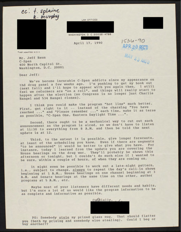 Promotes a book and suggests how C-SPAN could improve call-ins and accessibility to program Television scheduling.