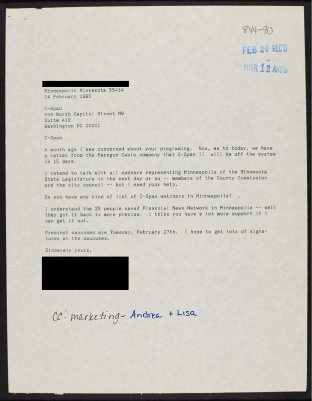 Letter to C-SPAN, 1990-02-14; 55414