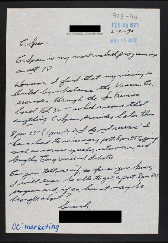 Complains cable company stops airing C-SPAN in the evening. Inquires if C-SPAN can fix it.