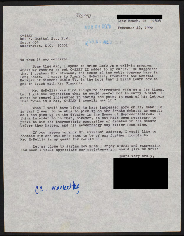 Requests contact information for the owner of their cable company so that C-SPAN2 can be added to the network's programming.