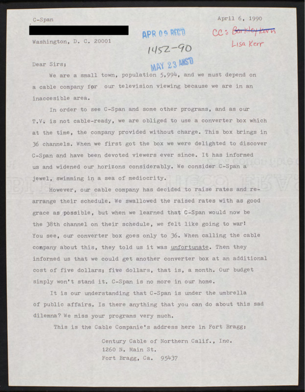 Letter to C-SPAN, 1990-04-06; 95437