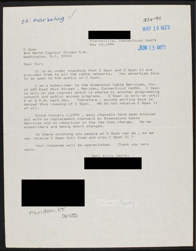 Explains that C-SPAN programming shares a channel and is only available at inconvenient times. Inquires about a solution for full-time C-SPAN.