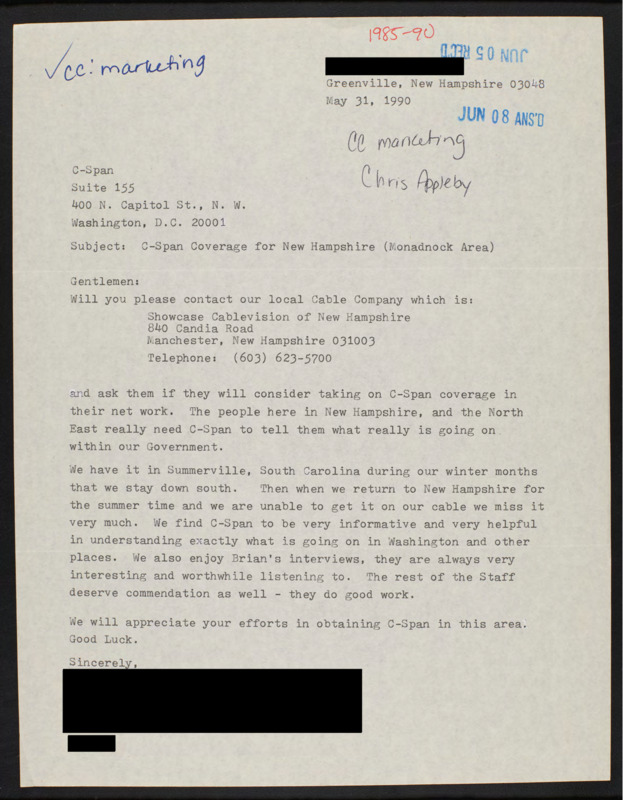 Letter to C-SPAN, 1990-05-31; 03048
