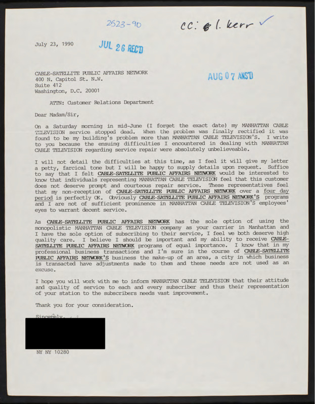 Complains about their local cable company taking a long period of time to repair access to C-SPAN programming.