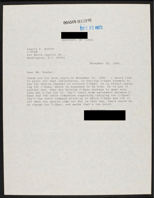 Claims local cable company is holding customers hostage by forcing payment for sports broadcasting in order to have access to C-SPAN.