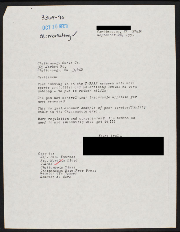 Expresses dissatisfaction with C-SPAN cutting broadcasts to air sports.