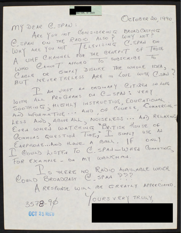Letter to C-SPAN, 1990-10-20; 10028