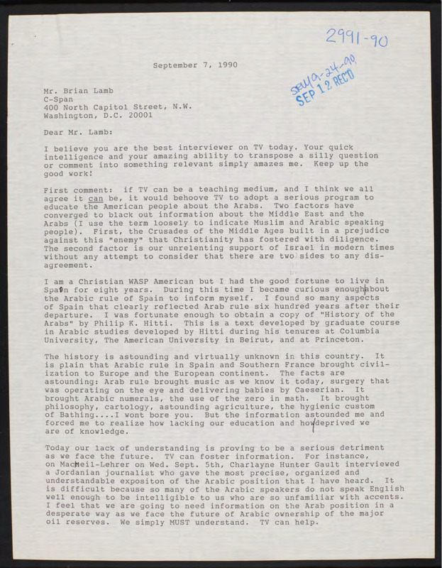Expresses concerns about Arab-Israeli relations and how that will impact Americans. Criticizes the Television scheduling of "call-ins" because only the unemployed and "ill-informed" are able to call during the day.