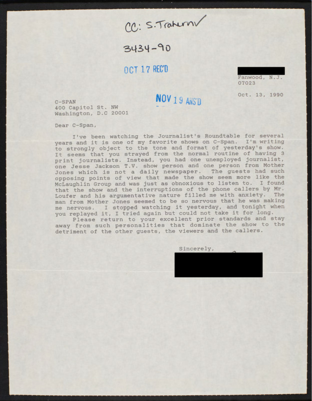 Complains about C-SPAN's choice of journalists to lead the "Journalist's Roundtable."