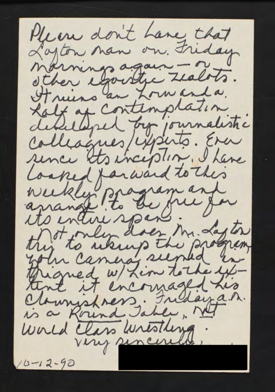 Explains that the Journalist Round Table is a favorite but requests C-SPAN to stop inviting a specific guest to the show.