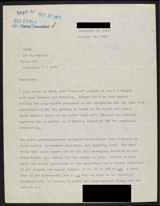 Letter to C-SPAN, 1990-10-18; 33809