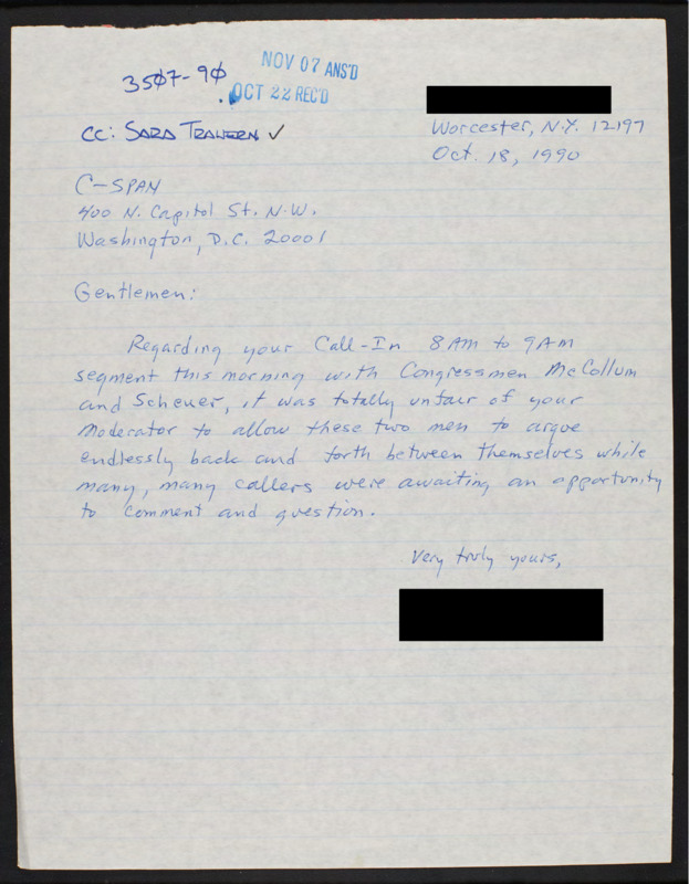 Complains about C-SPAN moderator for allowing two guests to argue and ignore the viewers' calls.
