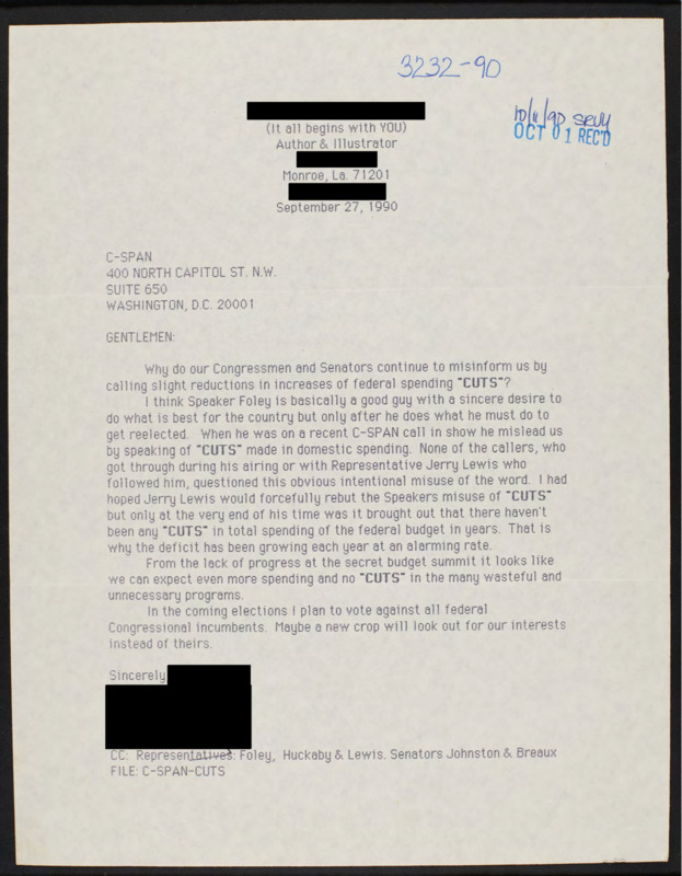 Letter to C-SPAN, 1990-09-27; 71201