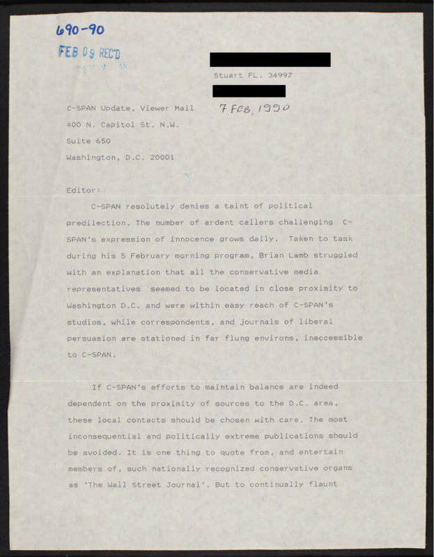 Letter to C-SPAN, 1990-02-07; 34997