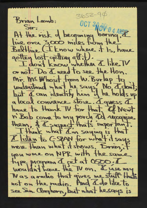 Initially discusses issues with senators and the economy. At the end of the letter there is praises Brian Lamb's book interviews.