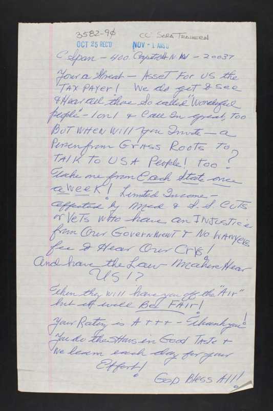 Praises C-SPAN as a fair program but suggests air time for grassroot organizations.