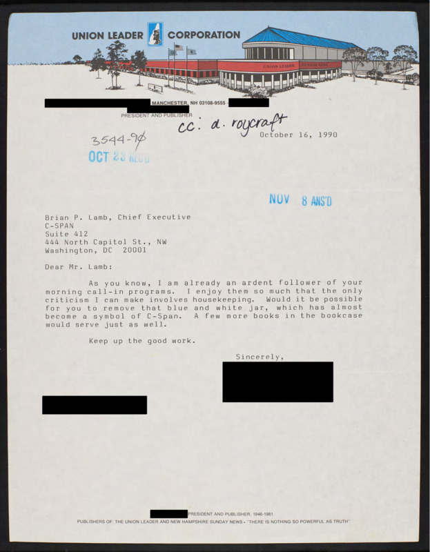 Suggests C-SPAN remove a jar on a shelf and replace it with Publication.