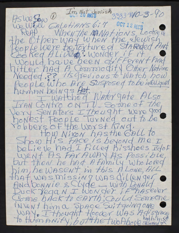 Criticizes the role of the United States in the Iran-Contra, believes political parties are corrupt, and that the U.S. has no humanity in allowing fornication and "murdering babies."