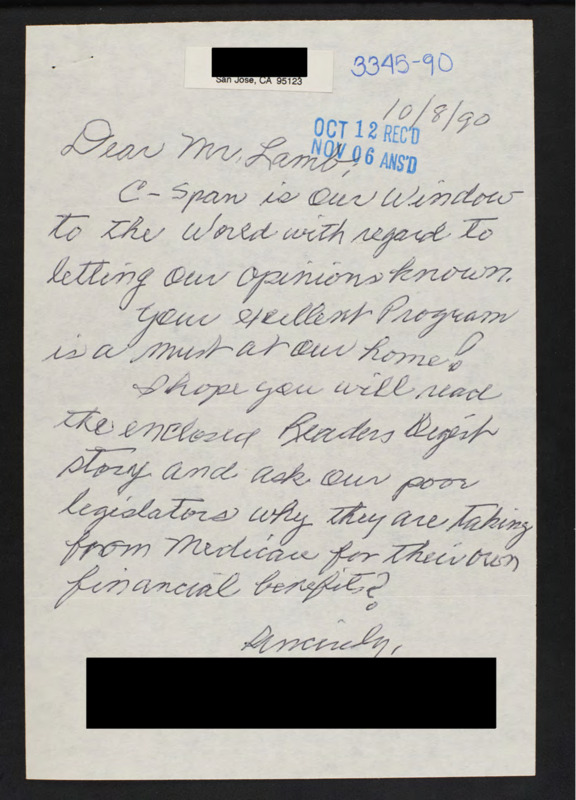 Praises C-SPAN programming and inquires why legislators are taking from Medicare.