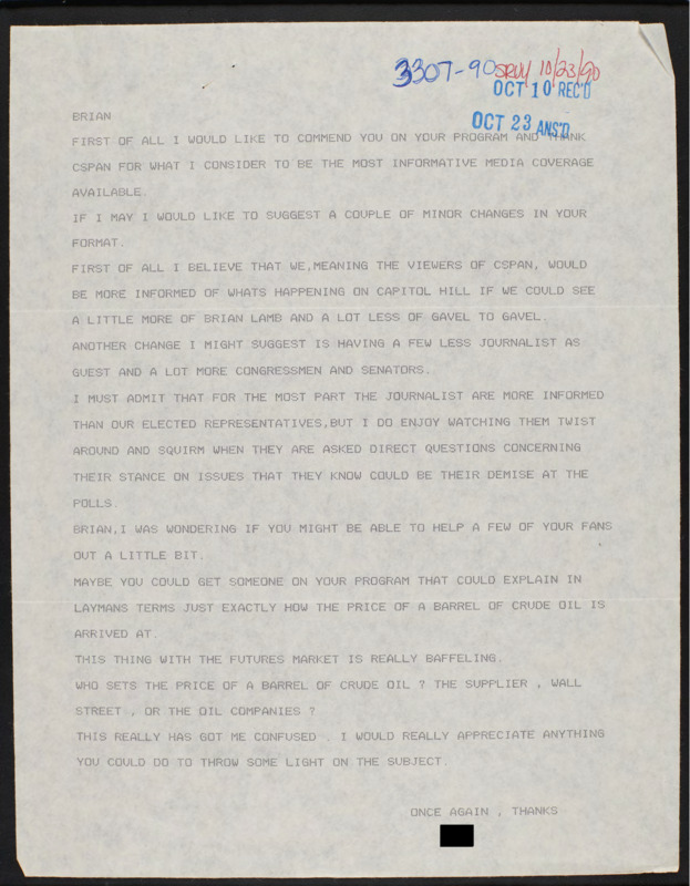 Suggests C-SPAN provide more air time for Brian Lamb and less journalists in favor of congressmen.