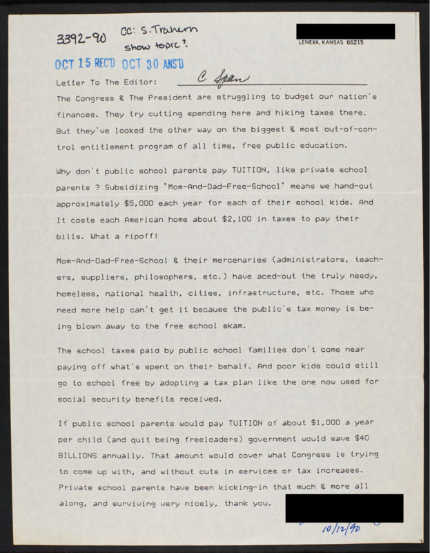 Letter to C-SPAN, 1990-10-12; 66215
