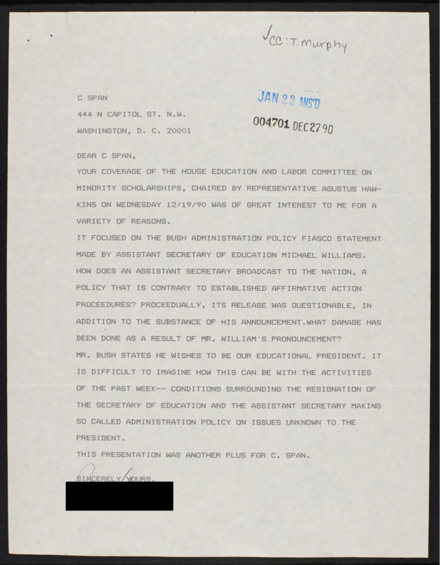 Praises C-SPAN's coverage of the House of Education and Labor Committee; the remainder of the letter criticizes George Bush's administration.