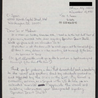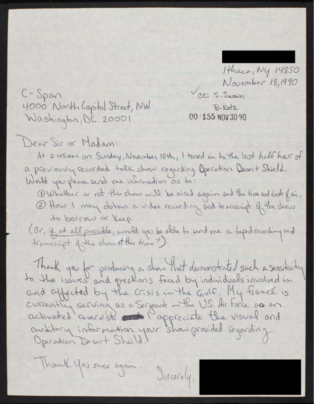 Inquires about C-SPAN re-runs and obtaining a tape; praises C-SPAN's coverage of the gulf crisis.
