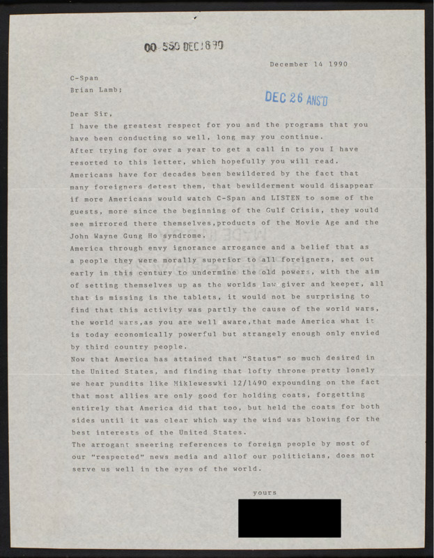 Criticizes American attitudes towards foreign people and idea of "superiority."