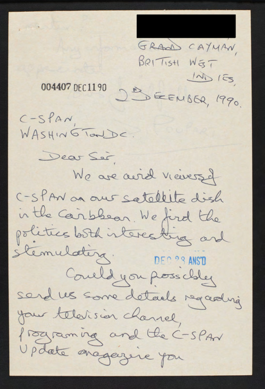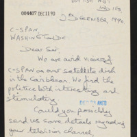 Praises C-SPAN programs as interesting and inquires about program Television scheduling.
