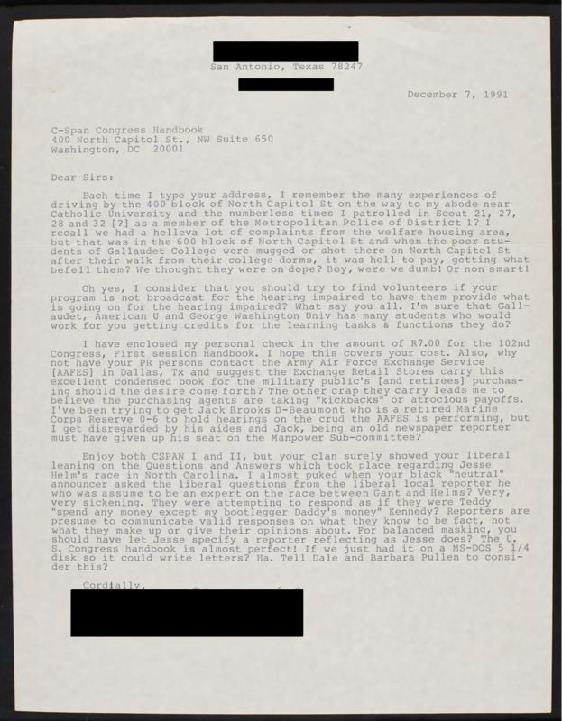 Recommends C-SPAN allow volunteers and interns to help the hearing impaired; requests a copy of C-SPAN's book; accuses C-SPAN of "liberal leaning."
