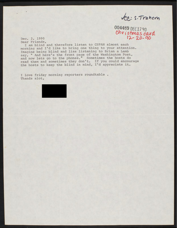 Suggests C-SPAN read when articles are placed on the screen because Blindness are unable to know what information is being relayed.