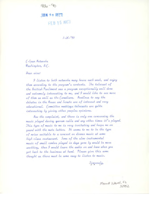 States they enjoy the broadcasts of United States Congress and British Parliament, but complains about the music played during quorum calls.